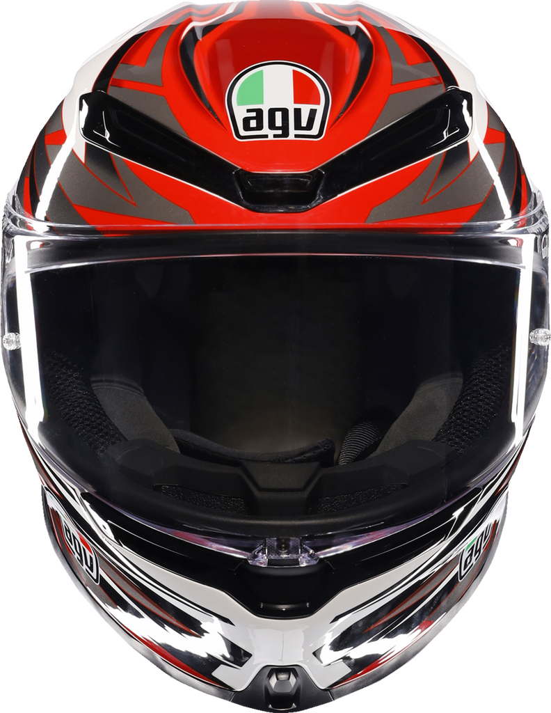 Wind protector included, Double D retention system, Shell, 5-density EPS, Carbon-Aramid fiber, Collarbone safe profile, Ventilation, One wide rear extractor and five front vents, Adjustable air vents, Aerodynamics, Integrated spoiler, Optimized for all riding positions, Shell shape designed to reduce turbulence, Interior, 2Dry: instant sweat absorption, Cheek pads safety release system, Ritmo fabric cheek pads to facilitate putting on/taking off the helmet, with cheekbone area in Shalimar fabric to ensure stability at high speed, Shalimar fabric crown pad for a soft and gentle touch, Embracing neck roll profile, Fit especially designed to allow wearing glasses, Microsense: premium skin comfort, Ritmo fabric neck roll and synthetic leather with high abrasion resistance and water-resistant properties, Ready for AGV ARK communication system, Removable nose guard
