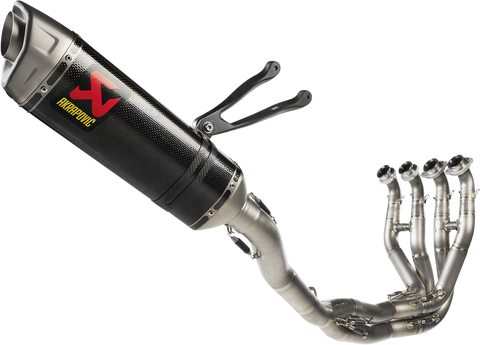 Upgrade your motorcycle*s performance with the AKRAPOVIC Evolution Line Exhaust System, designed specifically for high-performance racing applications. Constructed from lightweight, race-proven titanium alloys, this complete exhaust system offers a significant reduction in weight*over 13 pounds*while providing a substantial increase in power across the entire rev range. The system*s advanced design enhances torque delivery, resulting in improved acceleration and overall riding experience. The handcrafted, carbon-fiber hexagonal muffler, inspired by Jonathan Rea's World Superbike championship-winning machine, not only adds a sporty aesthetic but also contributes to the system*s unique and deep exhaust tone, emphasizing its performance heritage. Installing this system requires an ECU remap to fully unlock its potential, ensuring optimal engine tuning and performance gains. For added customization and durability, an optional aluminum muffler bracket is available to complement the system's sleek design and secure fit.