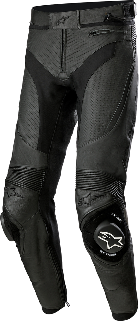 Featuring an engineered fit designed to deliver the highest level of active race protection, these pants are Tech-Air® ready and can accommodate the Tech-Air®10 Airbag System with its extended hip protection (sold separately), Perforated leather panel for optimal airflow, Comfort fit; design follows the contours of the knee for the optimal blend of comfort and freedom of movement, Dual layers in exposed areas for additional abrasion resistance, Premium leather main chassis constructed from 1.3mm genuine bovine leather, ‘High Flex’ design for an optimized fit and enhanced freedom of movement, Accordion leather stretch zones above the knee offer improved flexibility, Extensive stretch panels on calf and crotch area for improved fit and feel, Pre-curved leg construction helps improve fit and reduce riding fatigue, Extended high rear waist construction provides greater overlap with the riding jacket, Strategically positioned perforated leather panel on thigh for internal air cooling, Waist connection zipper allows attachment to Alpinestars riding jackets, Alpinestars GP-R Lite internal protection on knee, Hook and loop waist adjuster for secure and personalized fit, Internal mesh lining with stretch panel inserts work in conjunction with outer stretch zones for freedom of movement, Replaceable Sport knee sliders for excellent impact and abrasion resistance