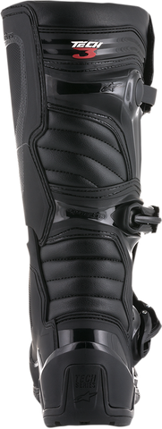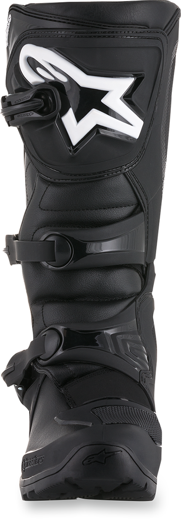 Boot upper construction is an innovative, lightweight microfiber material that is flexible and abrasion-resistant, Light microfiber on front and rear bellows provides a more comfortable flex area, Toe box is made of synthetic material for high abrasion resistance, Extended Polyurethane (PU) synthetic gaiter helps seal out water and dirt, Contoured Thermoplastic Polyurethane (TPU) calf guard, TPU higher medial guard, TPU outer lateral ankle guard and TPU heel counter for support and resistance to impacts, Rear TPU gaiter patch applied on the top of the TPU calf protector for comfort and impact resistance on the rear flex area, Injected TPU shin plate is connected with the TPU medial guard panel, Hook-and-loop upper boot closure with TR flap that provides a wide range of fit and support, TPU higher medial protector designed with technical texturing for improved grip, Biomechanical medial blade system allows good front/rear boot flex and added support and impact resistance for the ankle, Ergonomic TPU triple buckle straps wrap smoothly from the front flex and medial guard to the lateral side of the boot without compromising the boot's flexibility, Closure system uses three polymer buckles with ratchet closure, buckle memory system and quick release/locking system with a self-aligning design, All boot buckles are replaceable, One-piece TPU injected dual-compound foot shell is reinforced by a metal shank inside a co-injected toe reinforcement, Soft foam surrounds the ankles and boot collar for comfort and shock-absorbing performance, Entire boot is textile lined for comfort, Replaceable EVA footbed with textile top lining, Alpinestars all-terrain sole design with high-grip rubber compounds; sole is replaceable