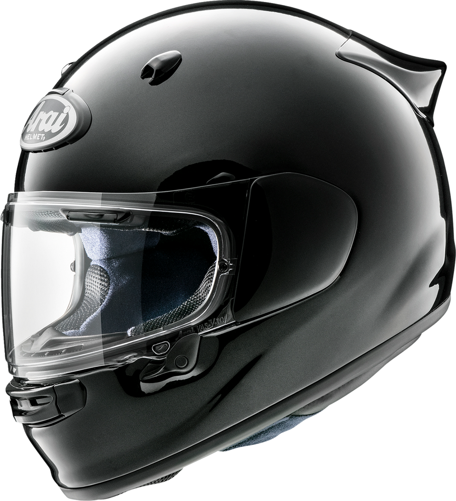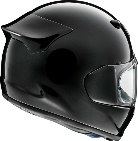The ARAI HELMETS Contour-X Helmet in Diamond Black offers advanced aerodynamic features and innovative ventilation systems designed for optimal riding comfort and safety. Featuring a sleek, organic outer shell crafted with Peripherally Belted Complex Laminate Construction (PB-cLc2), this helmet combines lightweight strength with durability, ensuring protection without excess weight. The shell design includes integrated side ducts and extra super fiber belting, which enhances rigidity in crucial areas while maintaining a streamlined profile for improved aerodynamics and reduced rider fatigue. The Variable Axis System (VAS) lowers the visor mounting position by an average of 24 mm across both temple areas, promoting a smoother shape that effectively deflects energy during impacts. The helmet*s shell flares 5 mm around the opening, facilitating easier donning and removal, especially for new users. A small stitched opening inside the neck roll allows for seamless wire management when installing communication systems, maintaining a clean aesthetic and functional integration. The Contour-X*s aerodynamic rear spoiler, inspired by the DF-X2 of the Corsair-X but redesigned for touring, features a one-piece exhaust/spoiler with a three-port design that efficiently draws air and smooths airflow over the helmet's sides, significantly reducing buffeting at highway speeds. This improves stability and decreases rider fatigue during long rides. The spoiler is constructed to break away upon impact, ensuring safety isn*t compromised. The helmet*s ventilation system includes a 3-position sliding chin vent with a large intake volume and a replaceable filter, operable with gloves for quick adjustments. Additionally, the helmet*s external communication system mounting points are designed to connect easily without compromising the inner EPS liner*s protective integrity. The integrated logo duct, merely 3.5 mm thick, feeds two central 10 mm intake ports and functions well at low speeds and in an upright riding posture. It can be opened or closed effortlessly using a short-stroke lever accessible with summer or winter gloves, and a simple visual cue indicates the duct's status. Overall, the Contour-X combines innovative aerodynamics, ventilation, and safety features in a stylish, lightweight shell, making it an excellent choice for touring riders seeking comfort, safety, and functionality in a premium helmet.