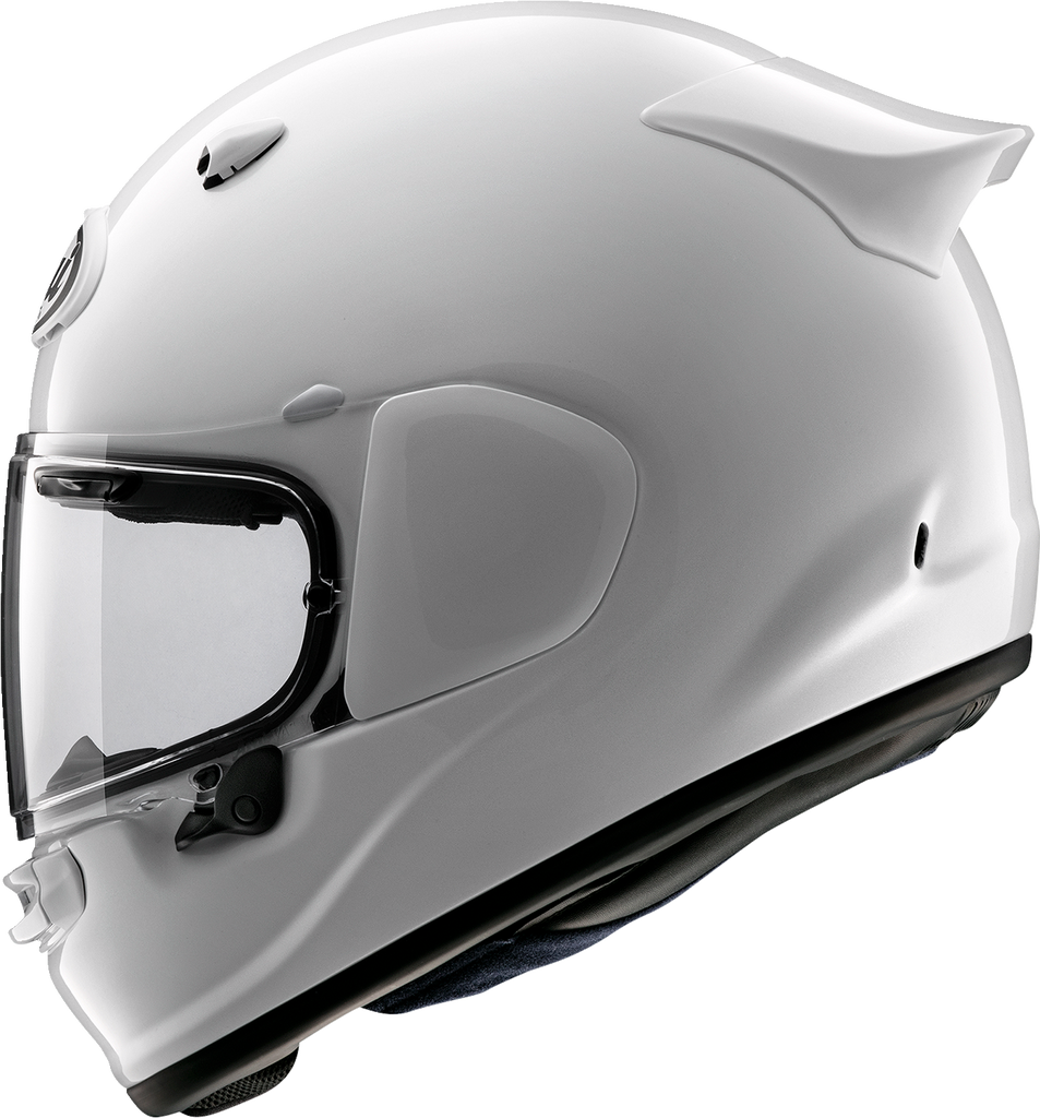 3D ARAI logo duct, just 3.5 mm in depth, feeds two central 10 mm intake ports, Logo duct works well at low speed and with an upright riding position and can be opened or closed easily with summer or winter gloves, via a short-stroke lever placed at the top* if the rider can't see the lever and the logo is in its normal place, the duct is open, Logo duct is designed to breakaway in the event of an impact, Aerodynamic rear spoiler with one piece exhaust function, The one-piece aerodynamic rear exhaust/spoiler, operated by a 3-way switch, is inspired by the DF-X2 of the Corsair-X, but redesigned for touring use, Rear spoiler sits a little more forward on the shell and is fed by 3 ports in the shell and efficiently draws air, but also smooths airflow over (and from the side) of the helmet, improving stability and reducing buffeting, especially while overtaking at highway speeds resulting in much less rider fatigue, Manufactured as thin and light as possible, the aerodynamic rear spoiler is designed to crush or break away upon impact, therefore having no influence on protective performance, 3-position (open, midway and closed) sliding air-scoop chin vent which flows a large intake volume of air and has a replaceable filter, Sliding chin vent actuating mechanism is thicker and easy to use with gloves, Designed to fit and connect a communication system easily on the shell exterior and without any compromise to the protection offered by the inner EPS liner, Outer shell design outlines a stylish, organic shape and uses Peripherally Belted Complex Laminate Construction (PB-cLc2) for lightweight strength and integrated side ducts, Extra layer of super fiber belting, in outer shell, maintains rigidity in a crucial area while offering flat sides for easy fitment of an intercom system, With Variable Axis System (VAS), the visor mounting position is lowered, yielding an average of an additional 24 mm across both temple areas, in pursuit of the ideal smoother shape that increases the ability of glancing off energy, Shell flares 5 mm around the opening, making it easier to get the helmet on and off (for newcomers to ARAI, the initial 'snugness' when putting the helmet on or taking it off can be challenging), For a nice, clean final look and ride, a small stitched opening on the inside of the neck roll allows the intercom system installer to easily tuck away any excess wiring that may be left-over after installing the speakers