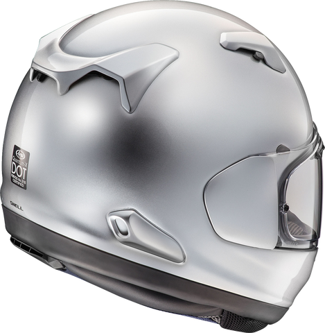 The ARAI HELMETS Quantum-X helmet in Aluminum Silver is engineered for riders seeking optimal comfort and enhanced safety. Its unique round oval shape is achieved through an interior headliner that combines thicker front and rear pads with thinner side pads, making it ideal for riders with slightly wider heads. This design ensures a snug fit that minimizes pressure points, providing a comfortable riding experience over extended periods. The helmet's lightweight construction, weighing approximately 76.8 ounces, contributes to reduced fatigue without compromising protective integrity.