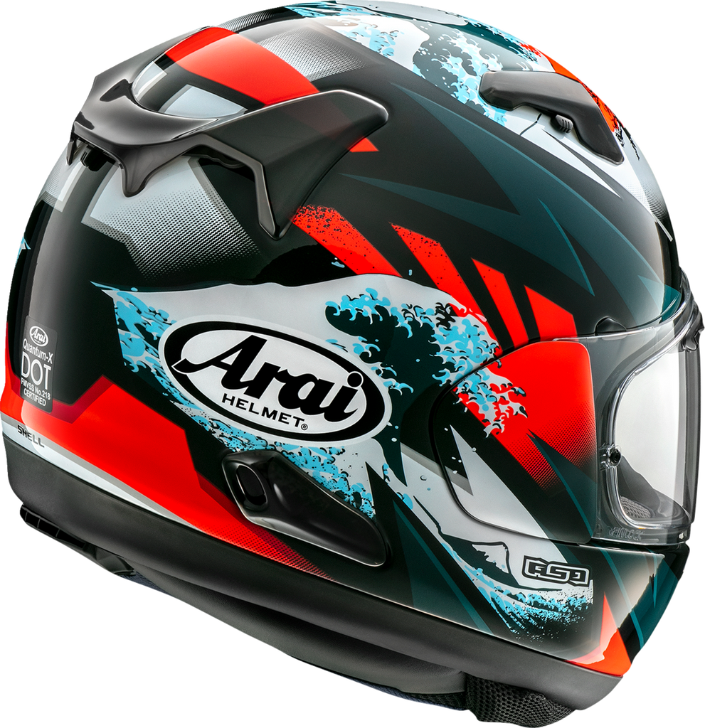 The ARAI Helmets Quantum-X Wave helmet is designed for riders seeking optimal comfort and advanced safety features. Its unique round oval shape, achieved through an interior headliner combining thicker front and rear pads with thinner side pads, ensures a secure fit for riders with slightly wider heads. This tailored design enhances comfort and stability during rides, reducing fatigue and ensuring the helmet stays snugly in place. Constructed with the peripherally belted - super complex laminate construction (PB-SCLC) shell, the helmet offers a durable yet lightweight profile, combining multiple materials and techniques for superior performance and affordability.