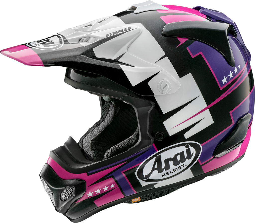 Peripherally Belted Complex Laminate Construction (PB-CLC) shell, Chin bar vent grill installed on a rounded chin bar, mounted form the outside on the exterior vent cap and can be easily removed for cleaning or damage replacement*vent cap also designed to break way from the chin bar in event of impact, Features intermediate oval shape which fits the majority of head shapes in the North American markets, Consistently round and smooth shell, maintaining Glancing Off shape concept, Super Fiber provides 30% higher tensile strength than standard fiberglass and provides increased penetration resistance, Rounded chin bar maintains compact shell length resulting in less protrusion, leaving it less likely to catch and dig during a spill, The Air-Through top-rear-duct center brace also functions as a goggle-strap locator, Diffusers can be removed or replaced quickly and easily by removing a single screw on the rear-duct center brace, Removable neck roll allows easy and convenient cleaning of the helmet, Emergency release cheek pad design allows trained medical personnel easier access to an injured rider, reducing the chance of unintentional injury, Air outlets on the peak are made larger to compensate for increased lift and is made with durable, yet extremely flexible material, mounted with plastic screws designed to break on impact, so as to not snag on impact which could send energy into the helmet or cause excess rotational force
