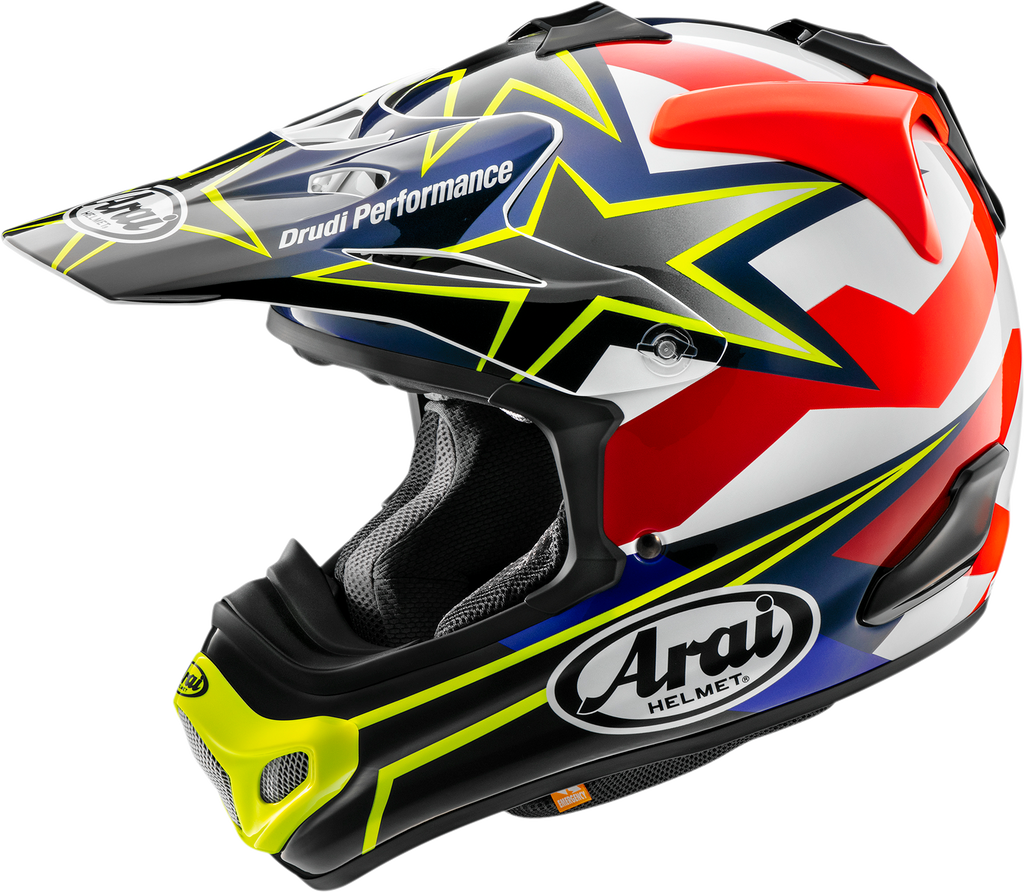 Features intermediate oval shape which fits the majority of head shapes in the North American markets, Consistently round and smooth shell, maintaining Glancing Off shape concept, Rounded chin bar maintains compact shell length resulting in less protrusion, leaving it less likely to catch and dig during a spill, Super Fiber provides 30% higher tensile strength than standard fiberglass and provides increased penetration resistance, Peripherally Belted Complex Laminate Construction (PB-CLC) shell, Chin bar vent grill installed on a rounded chin bar, mounted form the outside on the exterior vent cap and can be easily removed for cleaning or damage replacement*vent cap also designed to break way from the chin bar in event of impact, The Air-Through top-rear-duct center brace also functions as a goggle-strap locator, Diffusers can be removed or replaced quickly and easily by removing a single screw on the rear-duct center brace, Air outlets on the peak are made larger to compensate for increased lift and is made with durable, yet extremely flexible material, mounted with plastic screws designed to break on impact, so as to not snag on impact which could send energy into the helmet or cause excess rotational force, Emergency release cheek pad design allows trained medical personnel easier access to an injured rider, reducing the chance of unintentional injury, Removable neck roll allows easy and convenient cleaning of the helmet