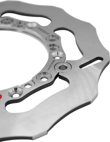 Wave outer profile designed for better heat distribution , Oversize thickness 4.5 mm and full friction ring to maximize heat capacity, 3 fixed points to increase stiffness, and 3 floating to better manage the deformation due to heating, Pins are flush on the outer side, for maximum clearance with caliper and bracket