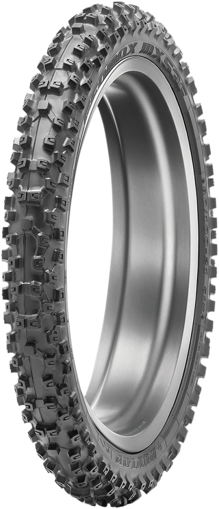 The Dunlop Geomax MX53 front tire features a horseshoe pattern of blocks that reduces stiffness in the center, providing greater ride compliance for motocross enthusiasts. This innovative tread design not only enhances comfort but also improves dirt grip, ensuring better braking performance on challenging terrains. The unique pattern effectively channels dirt away, delivering consistent traction when you need it most. Designed for intermediate to hard terrain, this tire offers a balanced blend of flexibility and durability for competitive and recreational riders alike. The inclusion of tie bars between select knobs minimizes flex at the knob bases, significantly extending tire lifespan and maintaining optimal contact with the ground during aggressive riding. The advanced Block-In-A-Block technology incorporated into the front tire further enhances durability by reinforcing the tread structure, allowing for reliable performance over rough tracks. Dunlop's Advanced Apex Design improves shock absorption by dispersing impacts through a taller, thinner apex within the sidewall, contributing to a smoother ride and better control. Overall, the Dunlop Geomax MX53 front tire is engineered to deliver superior grip, stability, and durability in demanding motocross conditions, making it an essential upgrade for serious riders seeking performance and reliability.