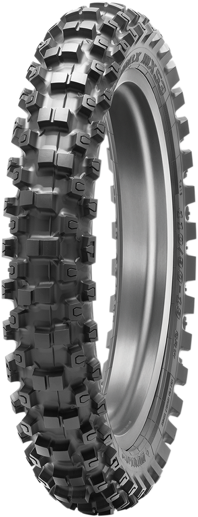 The Dunlop Geomax MX53 Rear Tire offers advanced performance for motocross riders tackling intermediate to hard terrain. Featuring a horseshoe pattern of blocks on the front tire, this design reduces stiffness in the center for improved ride compliance and enhances dirt grip for better braking performance. The unique pattern of horseshoe blocks ensures superior traction on challenging surfaces, allowing riders to maintain control during high-speed maneuvers. The tire's innovative Block-In-A-Block technology has been incorporated into the front tire, further increasing durability and grip under demanding conditions.