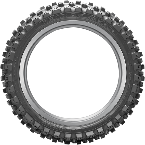 The Dunlop Geomax MX53 rear tire is engineered for intermediate-hard terrain, offering enhanced traction, stability, and durability. Featuring a horseshoe pattern of blocks on the front tire, this design reduces center stiffness to deliver greater ride compliance and improved handling over rough surfaces. The unique arrangement of the horseshoe blocks also provides superior dirt grip, allowing for confident braking and control in challenging conditions. The rear tire incorporates the innovative Block-In-A-Block shape, which introduces additional flexibility in the knobs to maximize grip while maintaining stability and slide control during aggressive riding. Dunlop's Advanced Apex Design further enhances shock absorption by dispersing impacts through a taller, thinner apex within the sidewall, ensuring a smoother ride on rugged terrain. Tie bars between select knobs on both front and rear tires reinforce durability by minimizing flex at the base of the knobs, prolonging tire life and maintaining consistent performance. Overall, the Geomax MX53 combines advanced tread patterns and structural features to deliver reliable performance for motocross riders seeking dependable grip and stability in intermediate-hard conditions.
