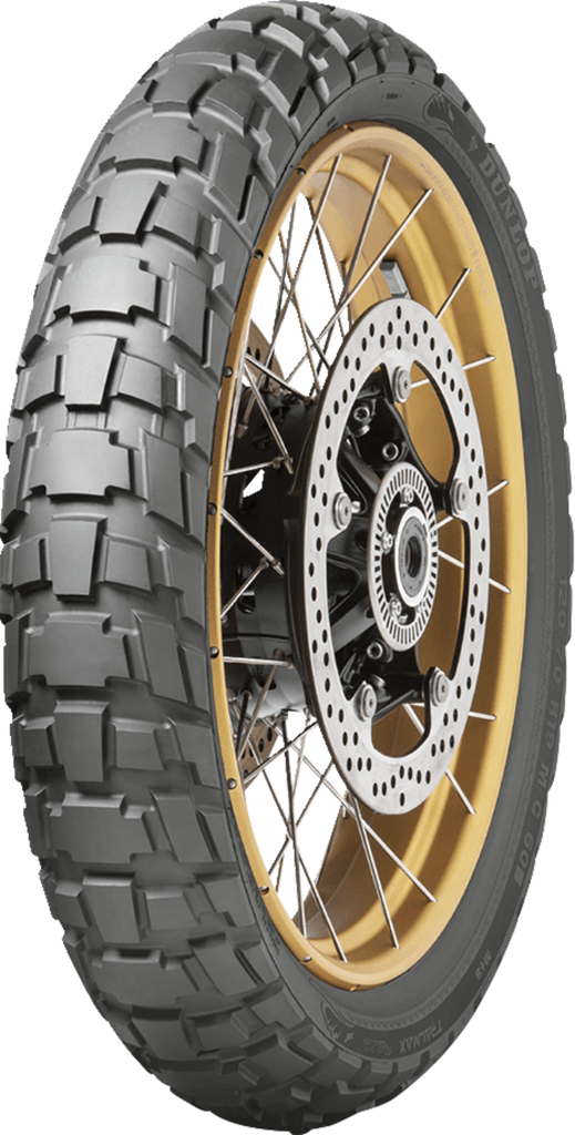 The DUNLOP Trailmax Raid front tire, part number 45260400, is engineered to deliver exceptional performance both on and off-road. Designed specifically for adventure motorcycles, this 90/90-21 tire features an aggressive tread pattern inspired by the popular D908RR, optimized to minimize rolling noise while enhancing road handling and stability. Its design offers excellent off-road traction and cornering grip, making it suitable for a variety of terrains and riding conditions. The tire's balanced handling ensures safety and confidence whether navigating rough trails or cruising on paved roads.