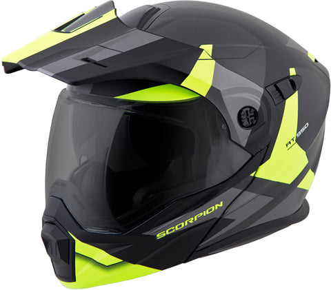 Introducing the EXO-AT950, a versatile modular adventure touring helmet. It has features and quality that you would expect to pay far more. The EXO-AT950 can be used as a full face adventure helmet with external peak visor attached, or the peak visor can be removed and you have an aerodynamic touring helmet. The no-fog Everclear® face shield can be removed and you can use the EXO-AT950 as a dirt helmet with goggles for off-road use. Our oversized eye port is extremely wide for greater peripheral vision and downward visibility, and the modular chin bar can be conveniently flipped up when you stop to get gas or ask for directions. The internal drop down sun visor and Kwikwick® II liner will keep you comfortable all day long even as lighting conditions change throughout the day. Three shell sizes made of advanced LG® polycarbonate and dual density eps, result in a helmet that is light weight, strong, and protective.