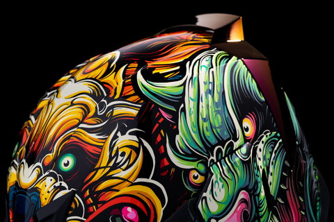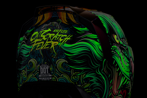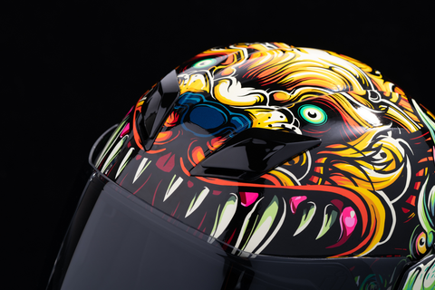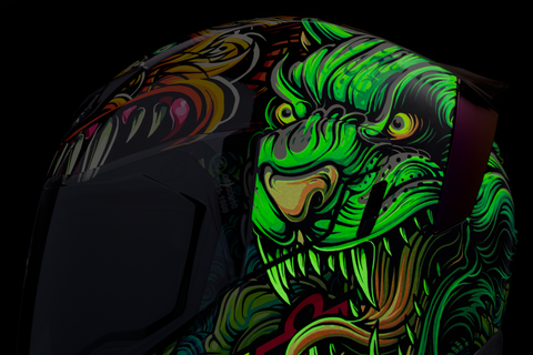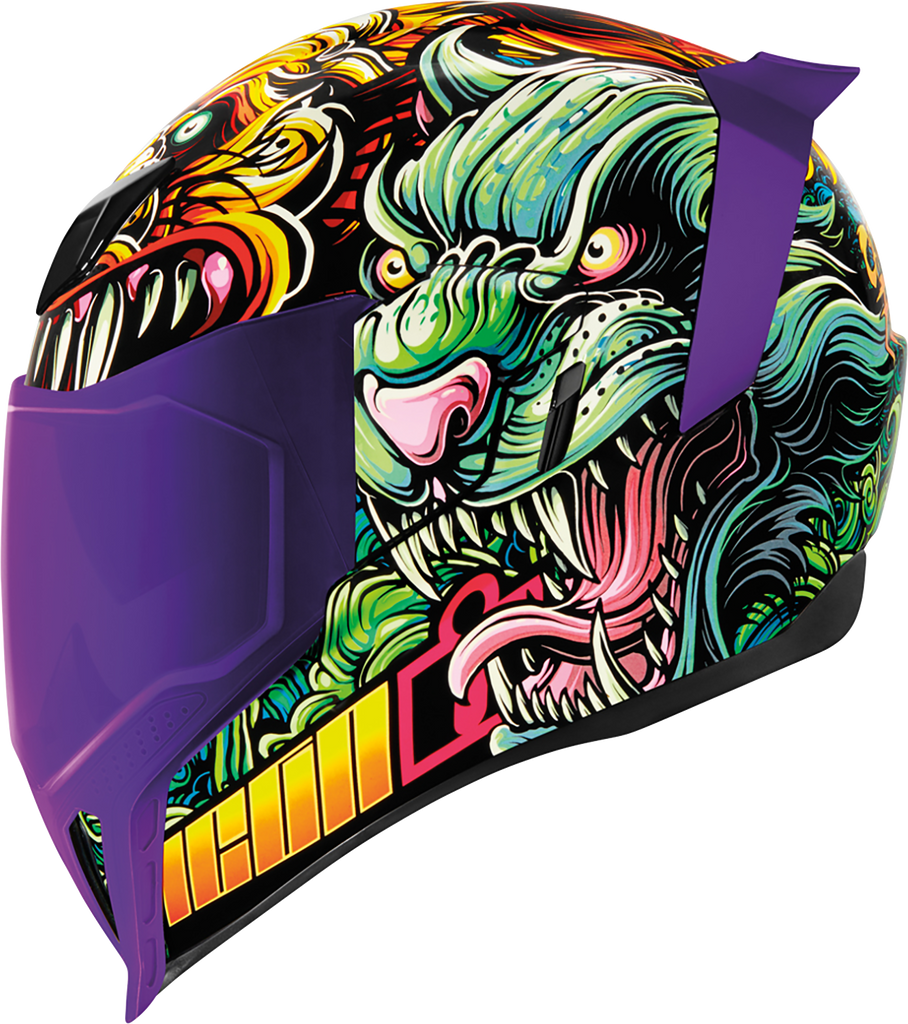 Fog-Free Dropshield* with exterior switch, Injection molded polycarbonate shell for strength, Recessed twin channel supervent cooling system, Quick-change Fog-Free Fliteshield* with sideplates, Removable molded breath deflector and chin curtain, Multiple oversized intake and exhaust ports, The Dropshield* visor must only be used while the main face shield is in the fully closed position, Internal speaker pockets work with ICON's R.A.U. Bluetooth device, Removable Hydradry* moisture wicking liner, Includes Clear Fliteshield* & RST Purple Forceshield*, Includes Dark Smoke Dropshield*