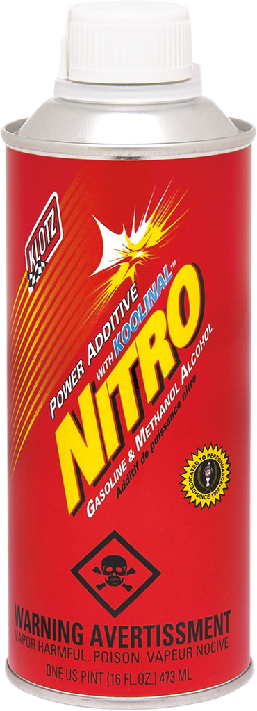 An oxygenating power additive developed for gasoline and methanol alcohol fuels, Designed to extract the maximum level of horsepower from stock and modified engines, Contains 50% nitropropane and 50% Koolinalâ„¢ as a blending and cooling agent that resists detonation and pre-ignition, Dyno testing indicates substantial power increases may be obtained when using Klotz Nitro, Available in 16-fluid ounce cans, 10 per case, Made in the U.S.A.