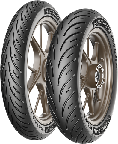 50% more wet grip than the previous generation - A compound mix incorporating Silica Rain Technology (SRT), an innovation which combined with a 26% void ratio gives 50% more wet grip than the previous generation [In-house comparison of the average wet lap times of the Michelin® Road Classic (1'02.81 seconds) and Michelin® Pilot® Activ (1'07.50 seconds) tires conducted on 6/16/2020 at Fontange track (1,2km) in France with front dimension 100/90B19 and rear dimension 130/80B17 on a Triumph® Bonneville T100.] Actual on-road results may vary, Increased cornering and straight-line stability than the previous generation - Thanks to its bias ply technology and bias casing supported by two crown plies the Michelin® Road Classic tire provides 50% more stability when cornering and 40% more straight-line stability than the previous generation [In-house subjective comparison of the Michelin® Road Classic and Michelin® Pilot® Activ tires at maximum vehicle speed conducted on 6/22/2020 at the Ladoux track (France) with front dimension 100/90B19 and rear dimension 130/80B17 on a Triumph® Bonneville T100.] Actual on-road results may vary, Sportiness - Great performance and looks thanks to the sport motorcycle tire inspired tread pattern, Modern technologies to make the most of your classic bike, Tubeless (TL), Blackwall
