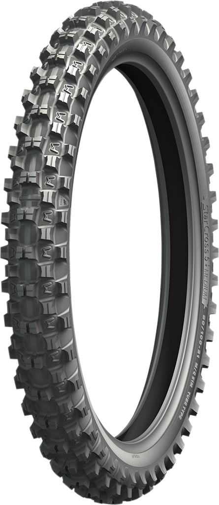 More lightweight and maneuverable, the new MICHELIN Starcross 5 Medium tire features a combination of technologies. The key point is its carcass, which is considerably more flexible. Its performance on straight stretches and curves is optimized, providing your motorcycle with improved traction and steadier handling around curves, High-performance motocross tires designed for mixed to hard terrain - Designed to deliver high levels of performance across the broadest range of conditions and terrain found in motocross and off-road riding, Versatile all-day performance - The tire's versatility allows riders to enjoy optimized performance in conditions and terrain that can often change over the course of a day, Traction at all lean angles - The intermediate tread blocks are positioned in staggered rows to maximize traction and feedback throughout varying lean angles, Designed to give the ultimate performance, Tube type (TT), Blackwall