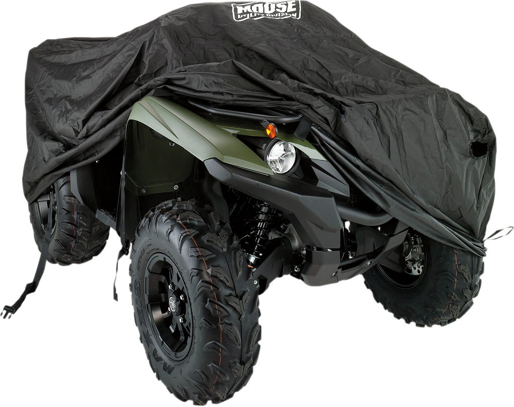 Two heavy-duty quick-adjustable straps and side-release buckles hold the cover on the ATV, Six tie-down locations allow for extra security, Made of tough PU-coated 600 denier polyester with durable water-repellent and UV treatment, Shrink-, stretch-, abrasion- and mildew-resistant, Double stitched hems with heavy-duty elastic shock cord at the bottom hem for snap tight fit, Generous fit to fully cover tires, Washable with mild soap and water, Dual back air vents reduce loft while trailering, Storage bag included