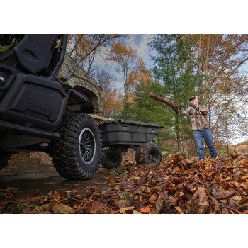 Durable 18-gauge steel construction; 11-gauge heavy-duty undercarriage and drawbar, Full-size body measures 48" L x 30" W x 12" H with a 1,000-lb. capacity, Trailer tilts for easy dumping, 3/4" axle, high-speed Graphoil caged roller bearings with a long shaft and 16" x 6.50" x 8" wheels, Removable tailgate; hitch pin included, Made in the U.S.A.