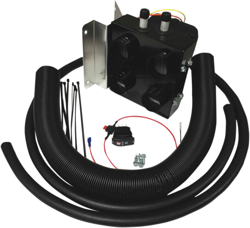 Water Operated cab heater for enclosed UTV's, 16,000 BTU units is direct-fit to the machine with core hidden from sight to prevent taking up cab space, Includes a heater hose, hose splicers, hose clamps, rocker switch, necessary wiring, and mounting bolts as needed, Quick and easy installation, Made in the U.S.A.
