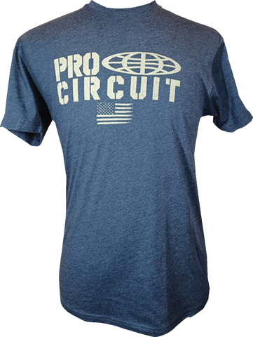 The PRO CIRCUIT Logo Flag T-Shirt in Heather Navy offers a stylish and comfortable option for motorcycle enthusiasts and fans of the brand. Crafted from high-quality materials, this t-shirt features a classic fit that provides all-day comfort and durability for everyday wear. The shirt showcases a bold American spin with the iconic PRO CIRCUIT globe logo prominently screen printed using vibrant, long-lasting inks, ensuring the design remains crisp over time.