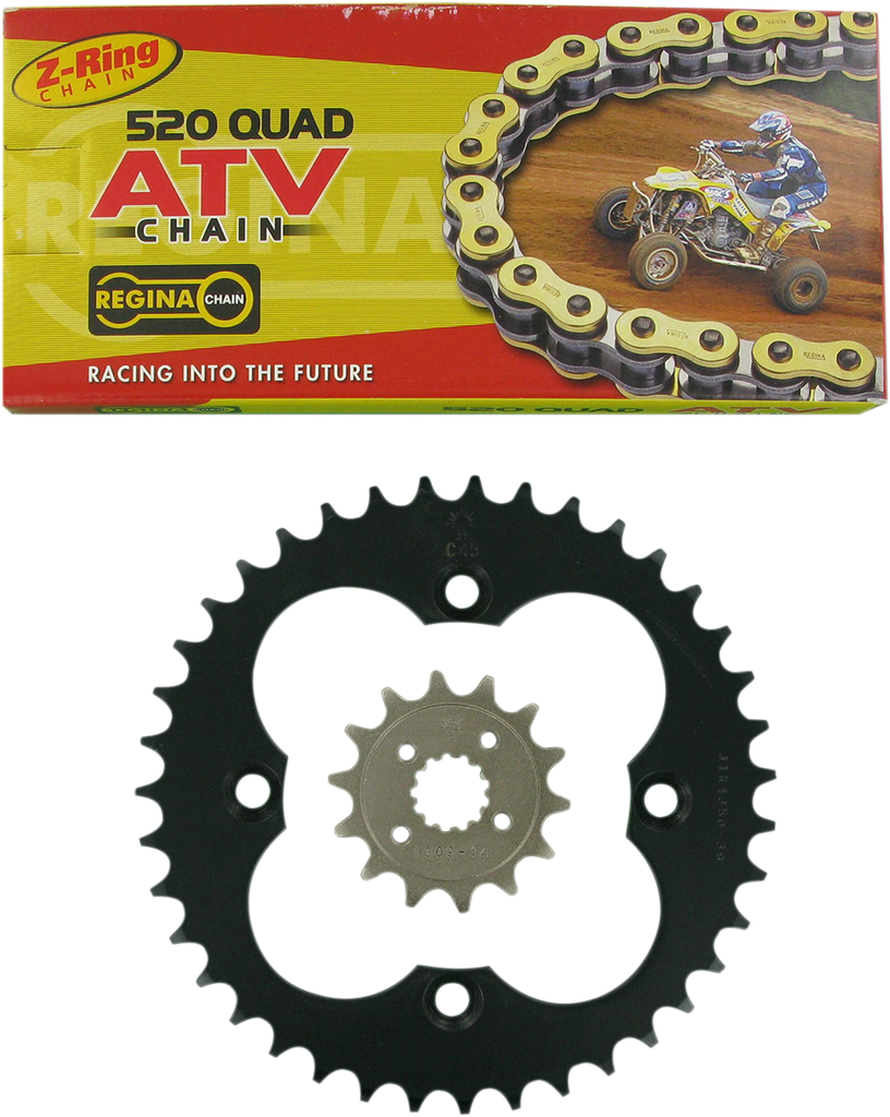 Economical kit comes with precut chain and front and rear sprockets, Chain is Regina’s high-performance 520 Quad Z-ring series (8,000 ft./lb. strength) with gold outer plates and Z sealing rings, which dramatically improve performance and wear life; includes clip-type masterlink, Sprockets are made of high-quality steel and have OEM gearing